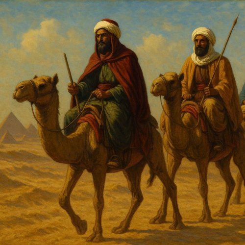 11. Группа торговцев с верблюдами, пересекающая пустыню.