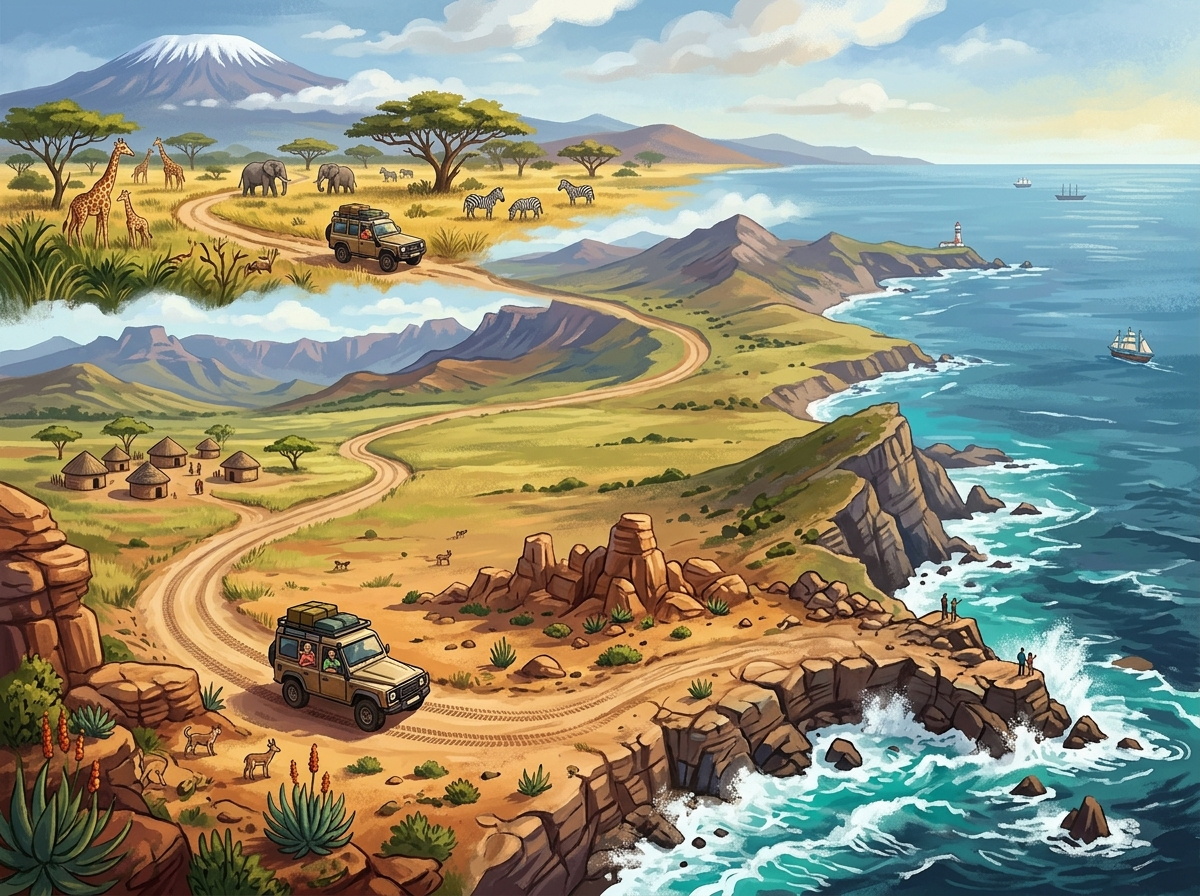 Иллюстрация по теме «Африка. Из Танзании к мысу Доброй Надежды» ярко передаёт многообразие африканского континента. На переднем плане — внедорожник, преодолевающий извилистую дорогу среди скал и пустынной растительности, символизируя дух приключений. Вдали раскинулась саванна с жирафами, слонами и зебрами, возвышается заснеженная гора (напоминающая Килиманджаро). Справа — живописное побережье с крутыми утёсами, кораблями и маяком. Композиция объединяет ключевые природные зоны Африки: саванны, пустыни, горные массивы, океанское побережье. Отлично подойдёт для презентаций по географии, биологии, экологии, МХК. Может быть свободно использована в образовательных целях.