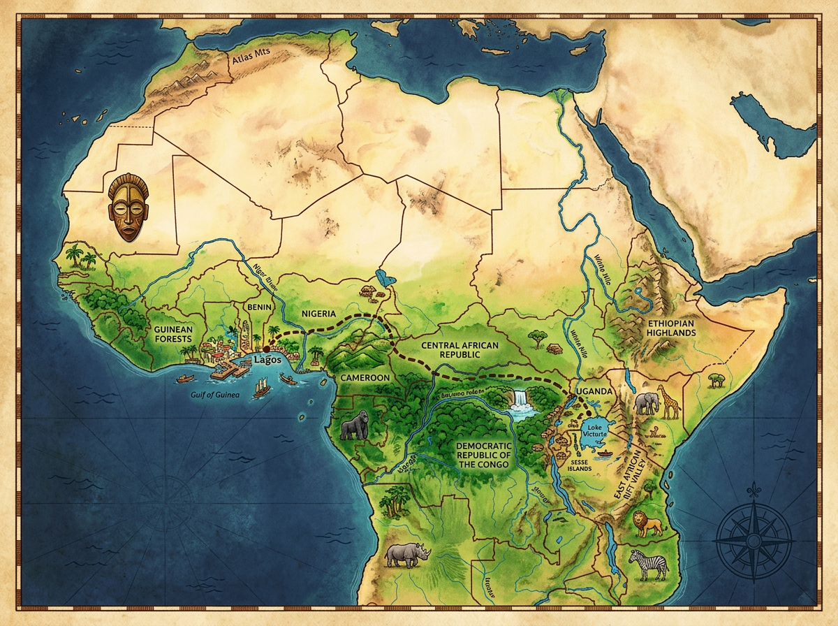 Иллюстрация по теме «Африка. От Лагоса до озера Виктория» представляет собой красочную карту региона с детализированными элементами: изображены густые гвинейские леса, пустынные просторы, горные массивы Атласа и Эфиопского нагорья, крупные реки и озёра, включая озеро Виктория. Видны ключевые города (например, Лагос), страны (Нигерия, Камерун, Уганда), природные зоны и характерные животные — слоны, жирафы, гориллы. Карта помогает визуализировать географическое разнообразие Африки, связи между природой и населёнными пунктами. Отлично подойдёт для презентаций по географии, биологии, истории, культурологии. Может быть свободно использована в образовательных целях.