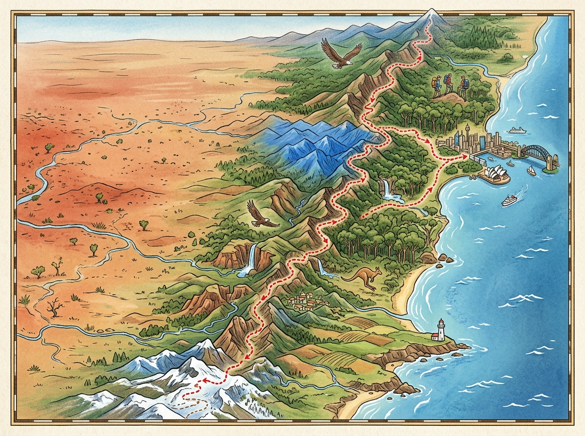 Иллюстрация по теме «Австралия. От Сиднея вдоль Большого Водораздельного хребта» представляет собой красочную карту-схему, визуализирующую маршрут вдоль одного из самых значимых природных объектов континента. На ней запечатлены ключевые ландшафты: заснеженные вершины, густые леса, засушливые равнины Аутбэка, живописные водопады и извилистые реки. Видны знаковые достопримечательности — Сидней с оперным театром и мостом Харбор-Бридж, а также типичные для Австралии животные (кенгуру, орлы). Карта помогает проследить смену природных зон и понять географическое разнообразие страны. Отлично подойдёт для презентаций по географии, экологии, туризму. Может быть свободно использована в образовательных целях.