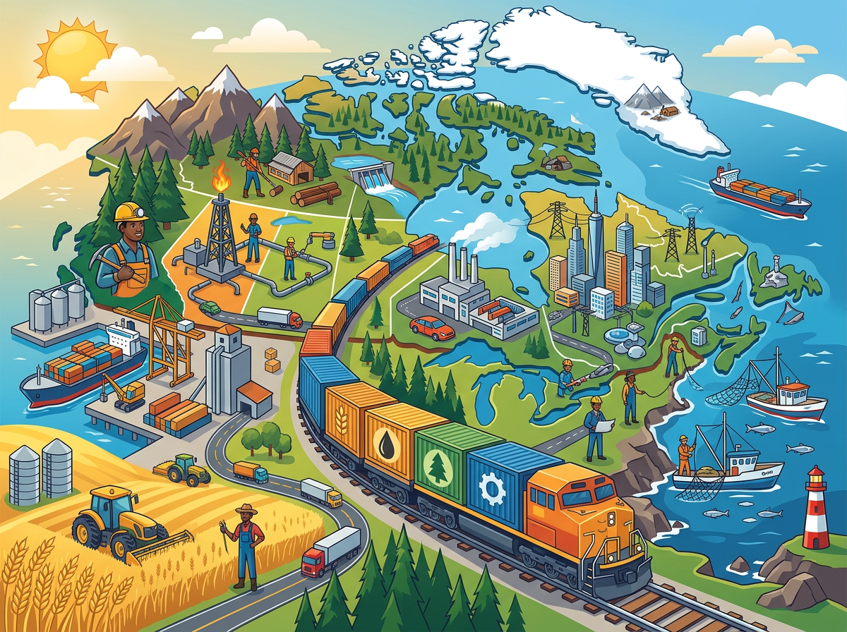 Иллюстрация по теме «Экономика Канады» наглядно демонстрирует ключевые отрасли страны. На переднем плане — сельскохозяйственные поля с трактором и фермером, символизирующие аграрный сектор. В центре — контейнерный поезд, отражающий развитую транспортную инфраструктуру. Слева изображены нефтяная вышка, лесозаготовки и портовые терминалы, подчёркивающие значимость добычи ресурсов и экспорта. Справа — рыболовные суда и маяк, указывающие на важность морского промысла. На заднем плане — промышленные предприятия, городские небоскрёбы и гидроэлектростанция.