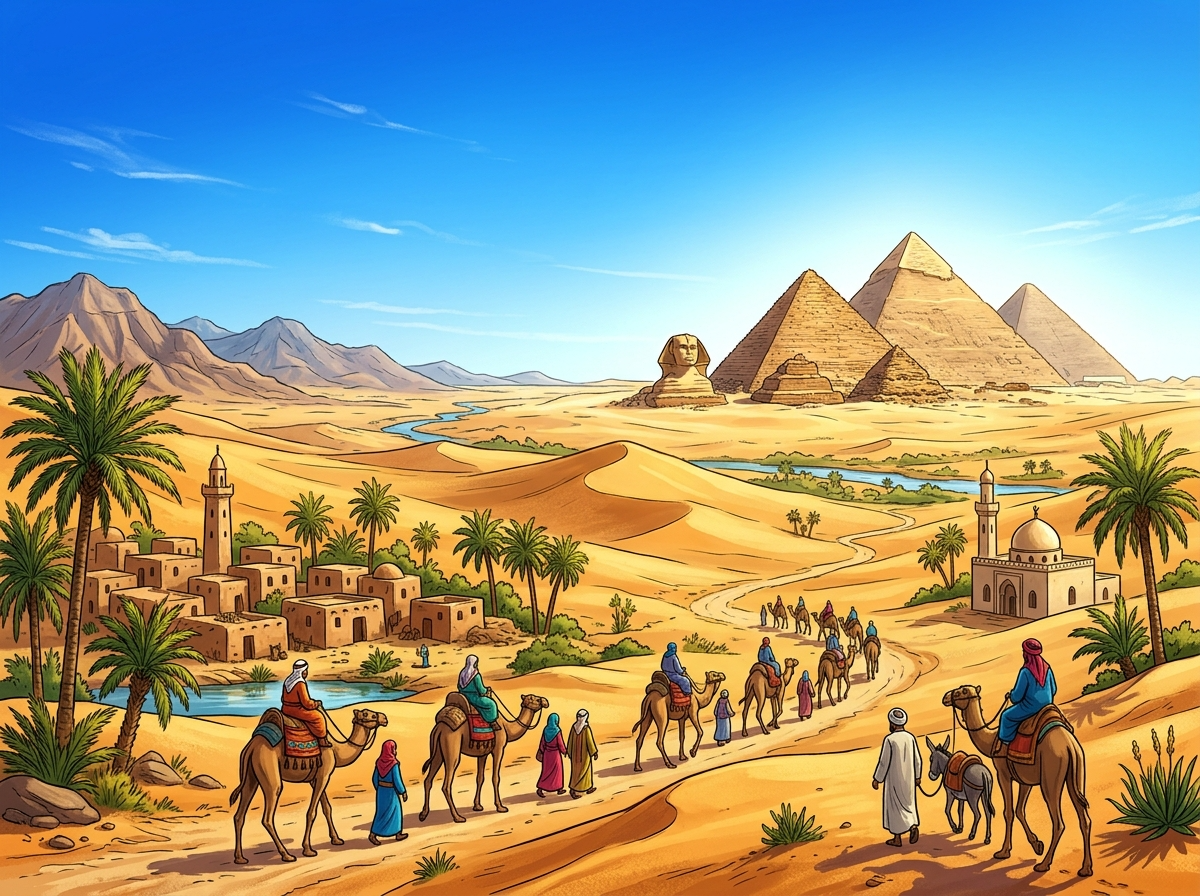 Иллюстрация по теме «Юго-Западная Азия и Северная Африка» — это изображение, погружающее в атмосферу древнего региона. На переднем плане караван верблюдов с путешественниками пересекает песчаные дюны, подчёркивая важность торговых путей. Слева — традиционные глинобитные постройки и минареты, символизирующие архитектуру региона. В центре — извилистая река, оживляющая пустынный ландшафт. На заднем плане величественно возвышаются пирамиды Гизы и Сфинкс — символы Древнего Египта. Пальмы и оазисы добавляют красок в пустынный пейзаж. Иллюстрация подойдёт для презентаций по географии, истории, культурологии, искусству. Может быть свободно использована в образовательных целях.