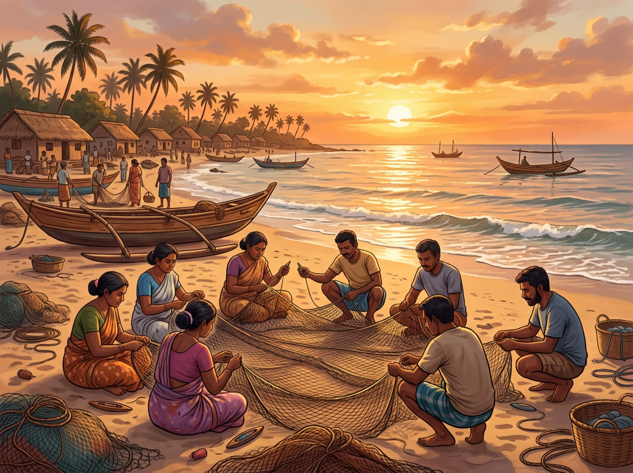 Иллюстрация по теме «Южная Азия. Население» ярко запечатлела повседневную жизнь прибрежного сообщества. На переднем плане — группа мужчин и женщин, занятых починкой рыболовных сетей на песчаном берегу. Их традиционная одежда подчёркивает культурную специфику региона. На заднем плане видны хижины с соломенными крышами, пальмы и рыбацкие лодки. Закатное солнце окрашивает сцену в тёплые оттенки, создавая атмосферу уюта и сплочённости. Иллюстрация подойдёт для презентаций по географии, этнографии, обществознанию, изучению традиций и быта народов Южной Азии. Может быть свободно использована в образовательных целях.