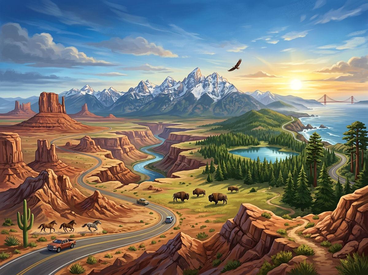 Иллюстрация по теме «США. Запад» ярко передаёт многообразие ландшафтов региона: на переднем плане — пустынные каньоны с кактусами, скальными образованиями и бегущими лошадьми, по дороге мчатся автомобили. В центре — зелёные леса, озеро и стадо бизонов, символизирующие богатую фауну. На заднем плане возвышаются заснеженные горы, а справа виднеется побережье с мостом, напоминающим Голден-Гейт. В небе парит орёл — символ свободы.