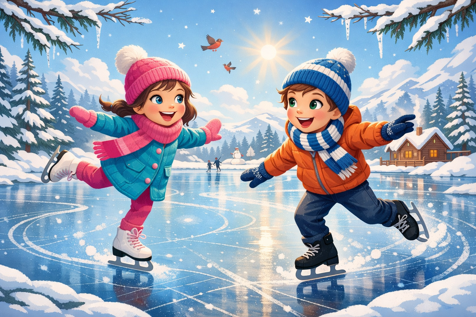 Иллюстрация «Зимние забавы: Коньки» запечатлела радостные моменты катания на коньках. Дети с азартом скользят по льду, познавая искусство фигурного катания и укрепляя здоровье. Зима зовёт к активным забавам!