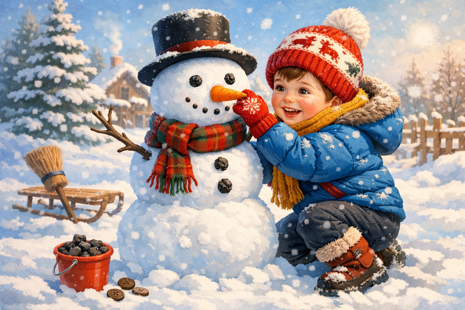 В одном небольшом городке жил-был мальчик по имени Саша. Он очень любил зиму: сверкающий снег, морозный воздух и весёлые игры на улице. Однажды в снежный день Саша решил слепить снеговика. Он скатал три снежных шара разного размера, сложил их друг на друга, добавил глаза из пуговиц, нос-морковку и улыбнулся своему творению.