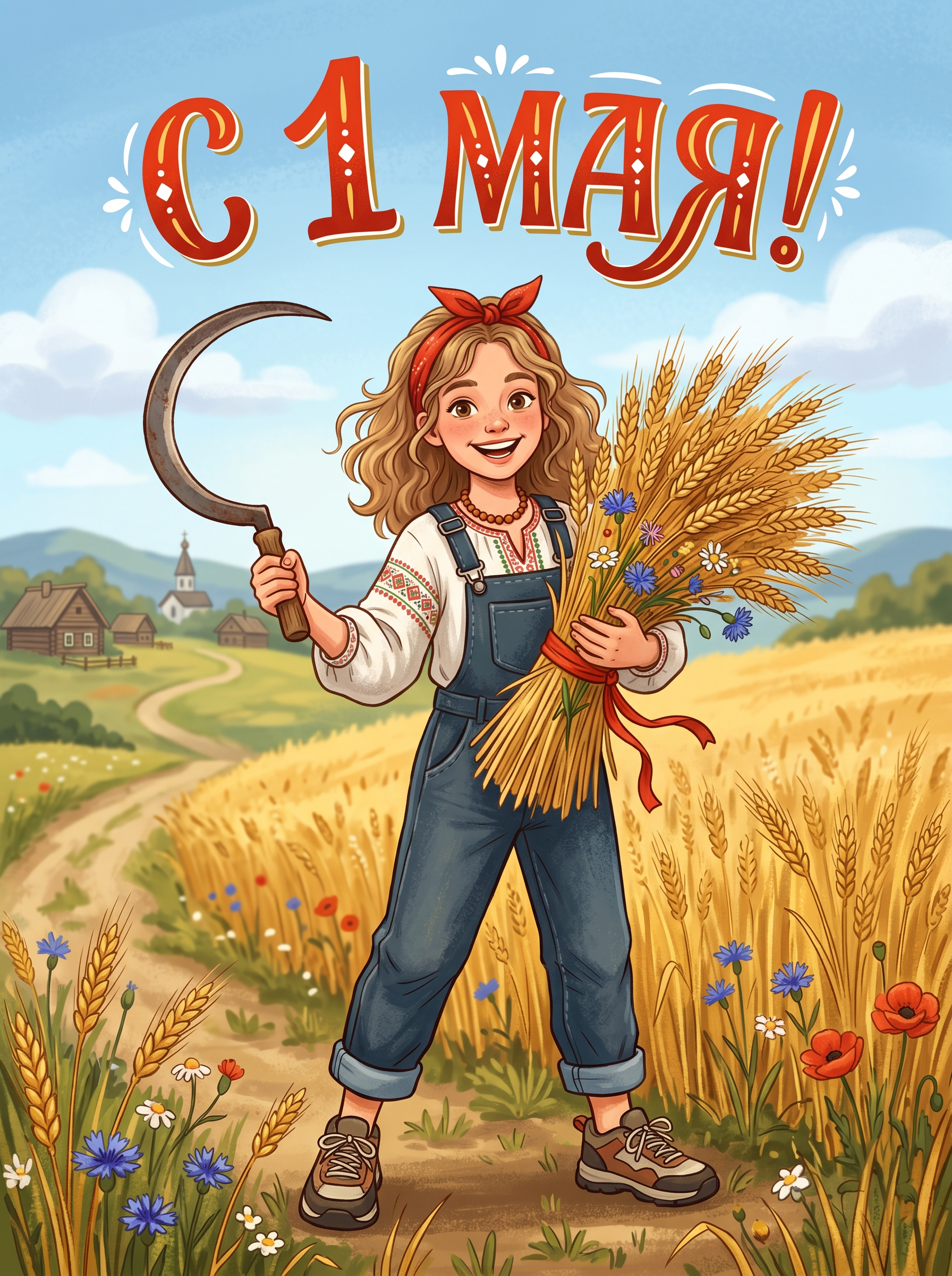 Открытка «С 1 мая: Девушка со снопом пшеницы» — это красочная иллюстрация, где молодая труженица символизирует плодородие и трудолюбие. Золотистые колосья и цветущий луг подчёркивают приход весны.