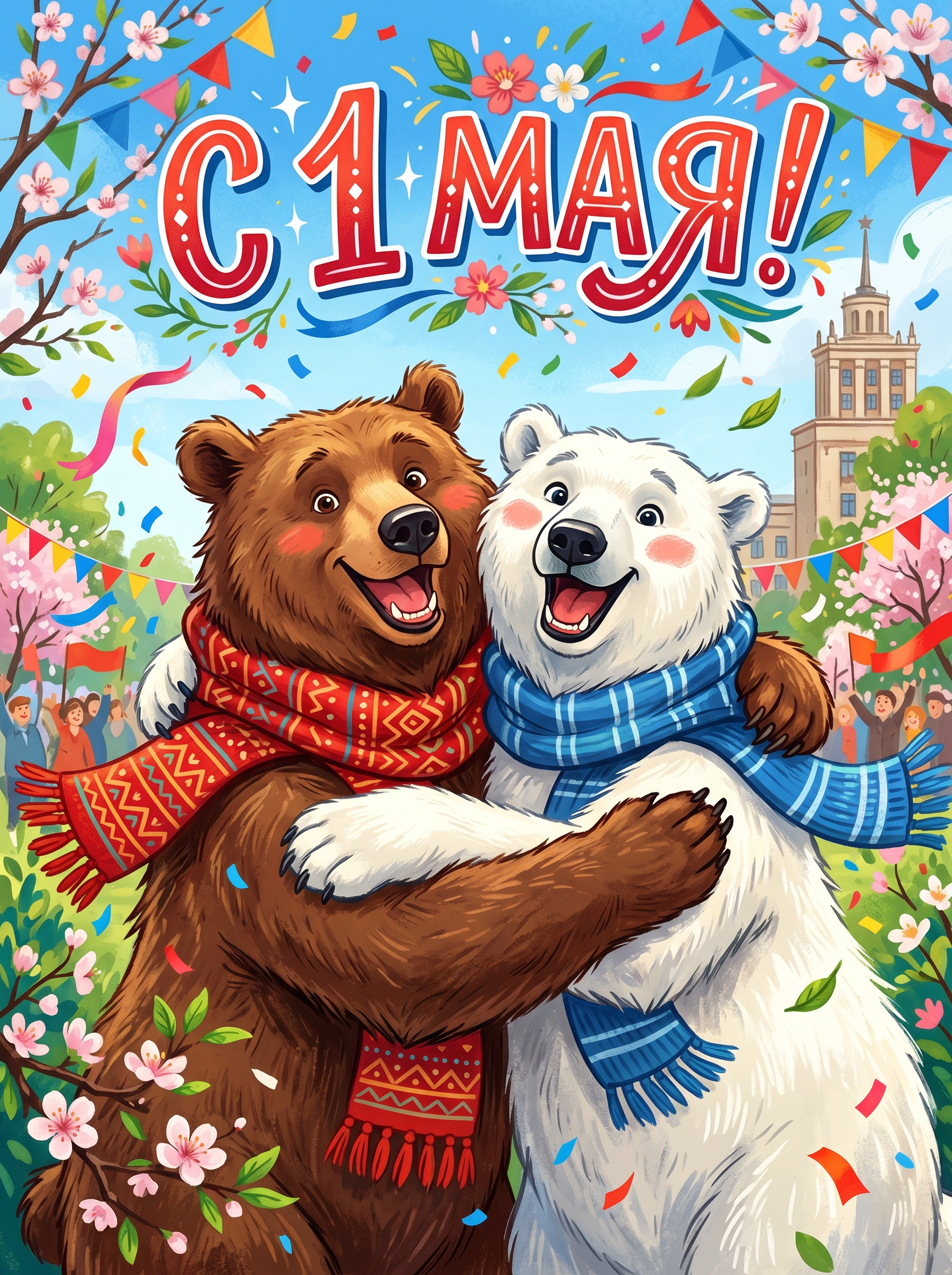 Открытка «С 1 мая: Два медведя» — это красочное воплощение весеннего настроения и духа единства. Бурый и белый медведи, обнявшись, радостно встречают 1 Мая. Их тёплые шарфы, сияющие улыбки и праздничный фон с флажками и цветущими деревьями символизируют дружбу, труд и радость жизни.