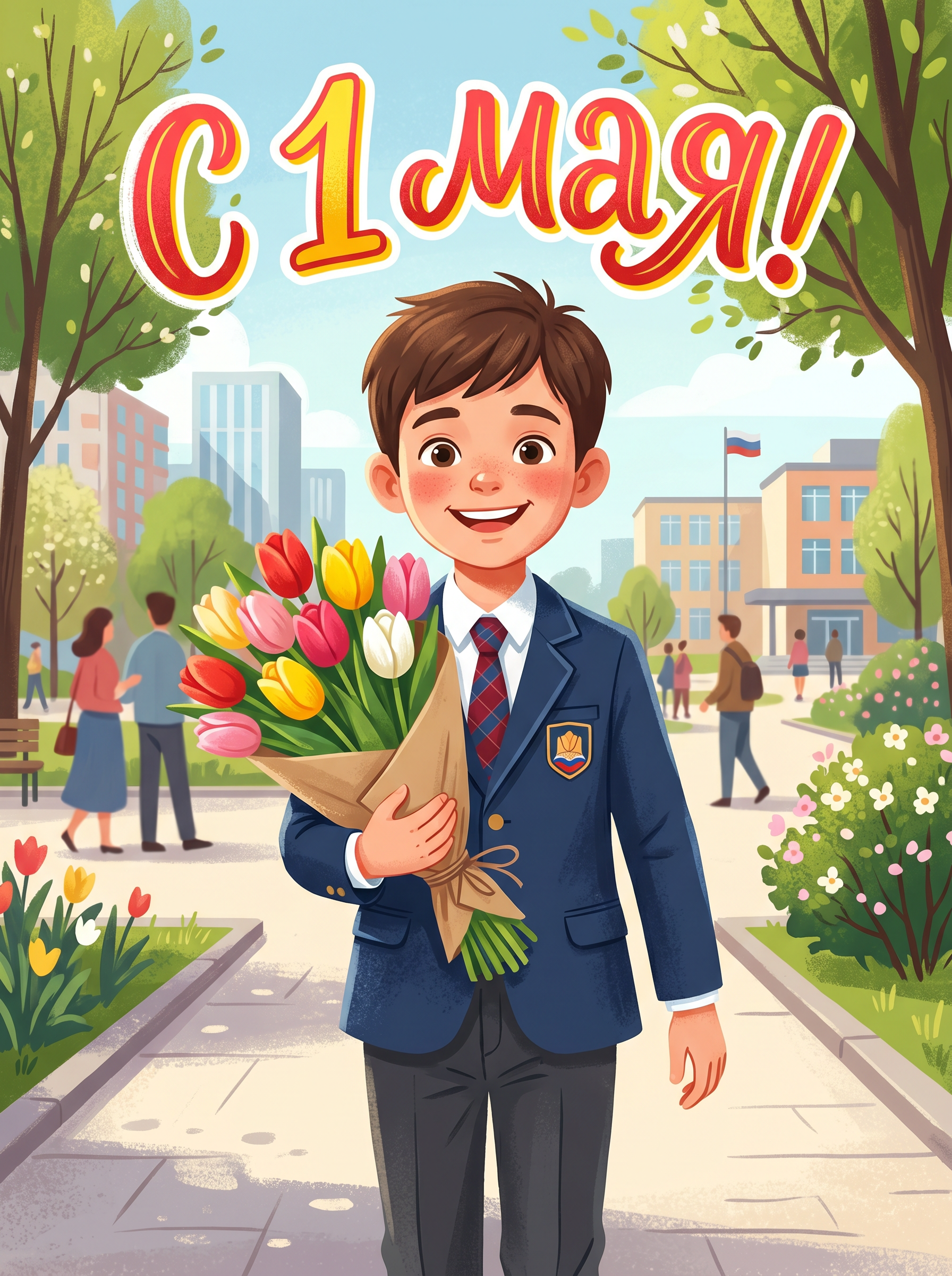 Открытка «С 1 мая: Мальчик с букетом тюльпанов» — это красочное воплощение духа 1 Мая: жизнерадостный мальчик с букетом символизирует молодость, энергию и уважение к труду. Тёплые тона и уютная городская сцена создают атмосферу праздника.