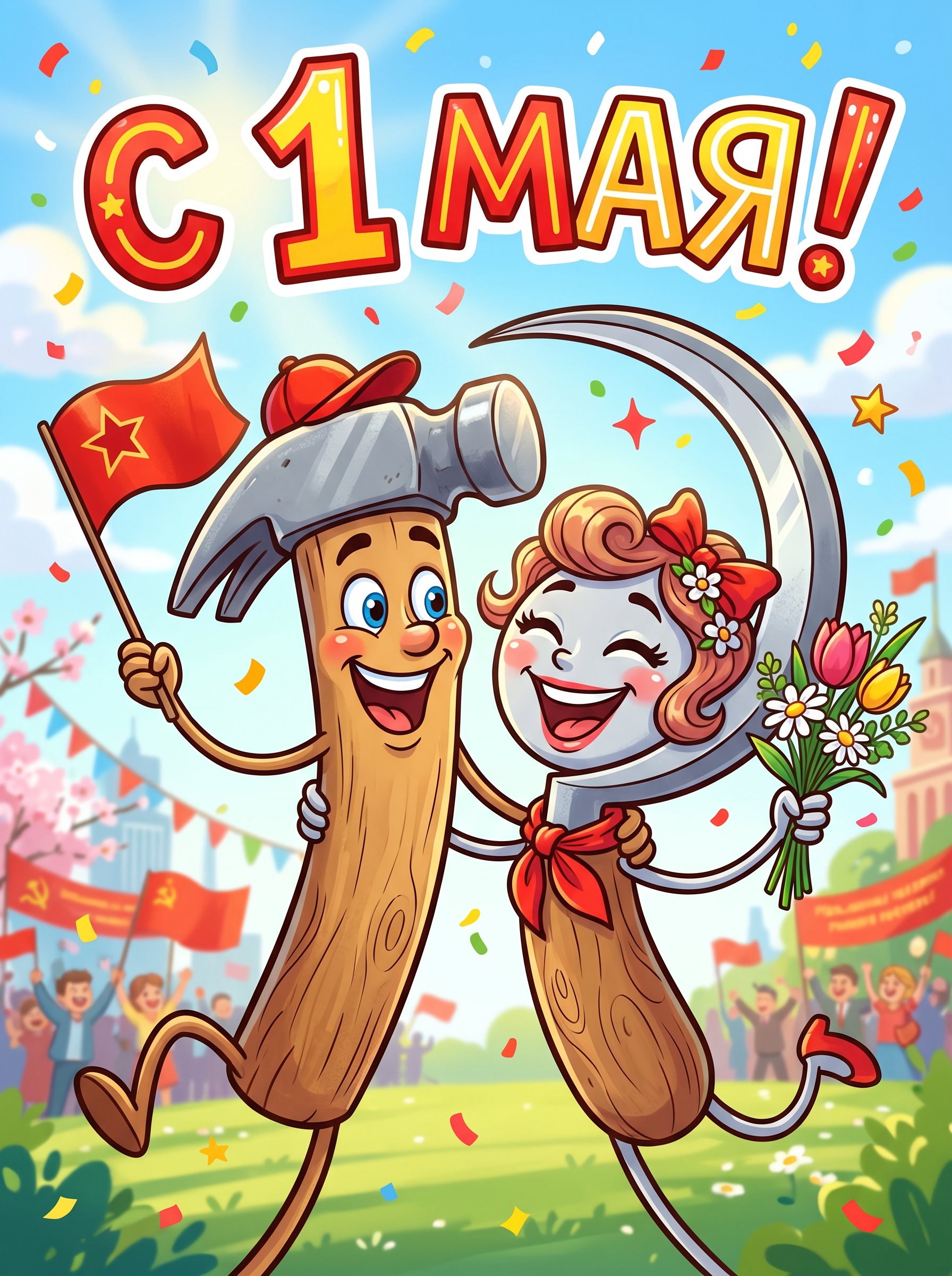 Открытка «С 1 мая: С праздником весны и труда» — это красочная иллюстрация духа праздника: улыбающиеся персонажи — молоток и серп — радостно танцуют, украшенные лентами и цветами. На фоне — весенняя поляна, флажки, улыбающиеся люди. Образ символизирует единство труда и радости, напоминая, что работа может быть в удовольствие. Тёплое поздравление для всех!