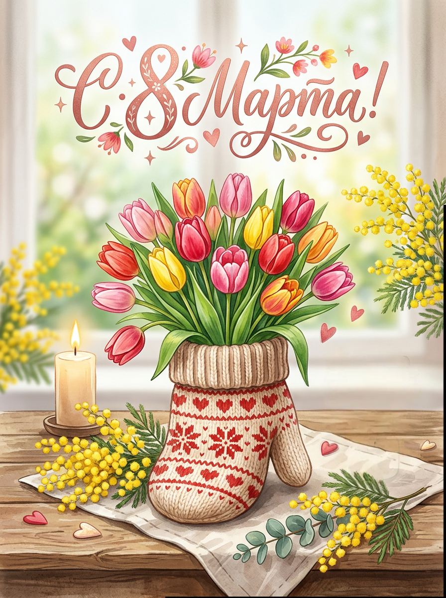 «С 8 Марта! Пусть нежность тюльпанов наполнит твой день светом и радостью.»