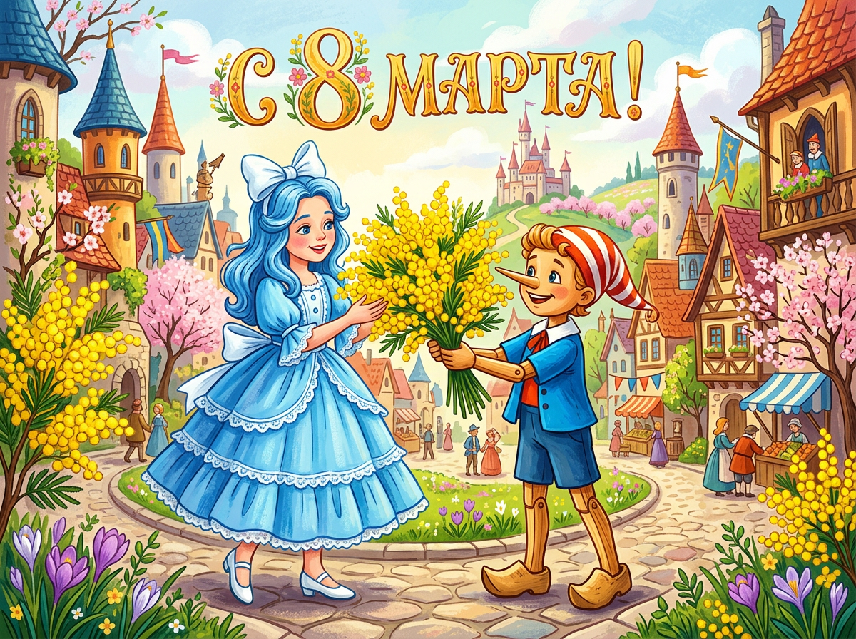 «С 8 Марта! От всей души поздравляем тебя — настоящую Мальвину нашего сердца! Твоя доброта и мудрость вдохновляют нас каждый день. Мы любим тебя и восхищаемся тобой так же, как герои сказки восхищались прекрасной Мальвиной!»