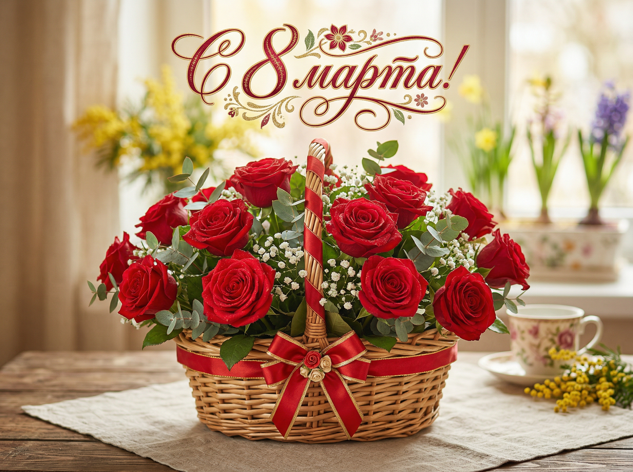 Открытка «С 8 марта: Корзина роз» — чарующее поздравление, словно портал в мир волшебства и красоты. В этой корзине — не просто цветы, а капли утренней росы, сплетённые в бутоны, и лучи восходящего солнца, застывшие в лепестках. Пусть твоя жизнь будет такой же прекрасной, как этот волшебный букет, а каждый день — праздником, достойным королевы!