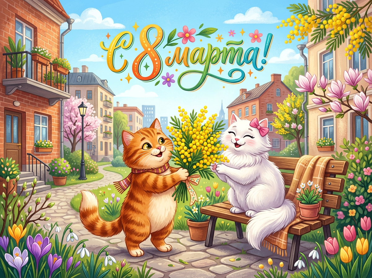 «С Международным женским днём, моя драгоценная кошечка! Ты — источник уюта и радости в нашем доме. Пусть твои дни будут такими же светлыми и приятными, как тёплые лучи весеннего солнца!»