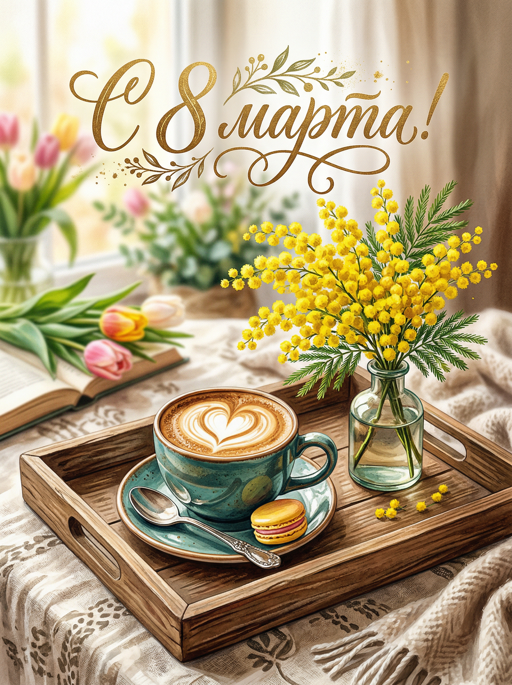 «С 8 Марта! Твой дом всегда наполнен чарующим ароматом кофе — пусть так будет всегда. Желаю тебе таких же ярких и приятных моментов в жизни, как первый глоток любимого напитка. Пусть каждый день будет таким же тёплым и уютным, как чашка хорошего кофе!» -