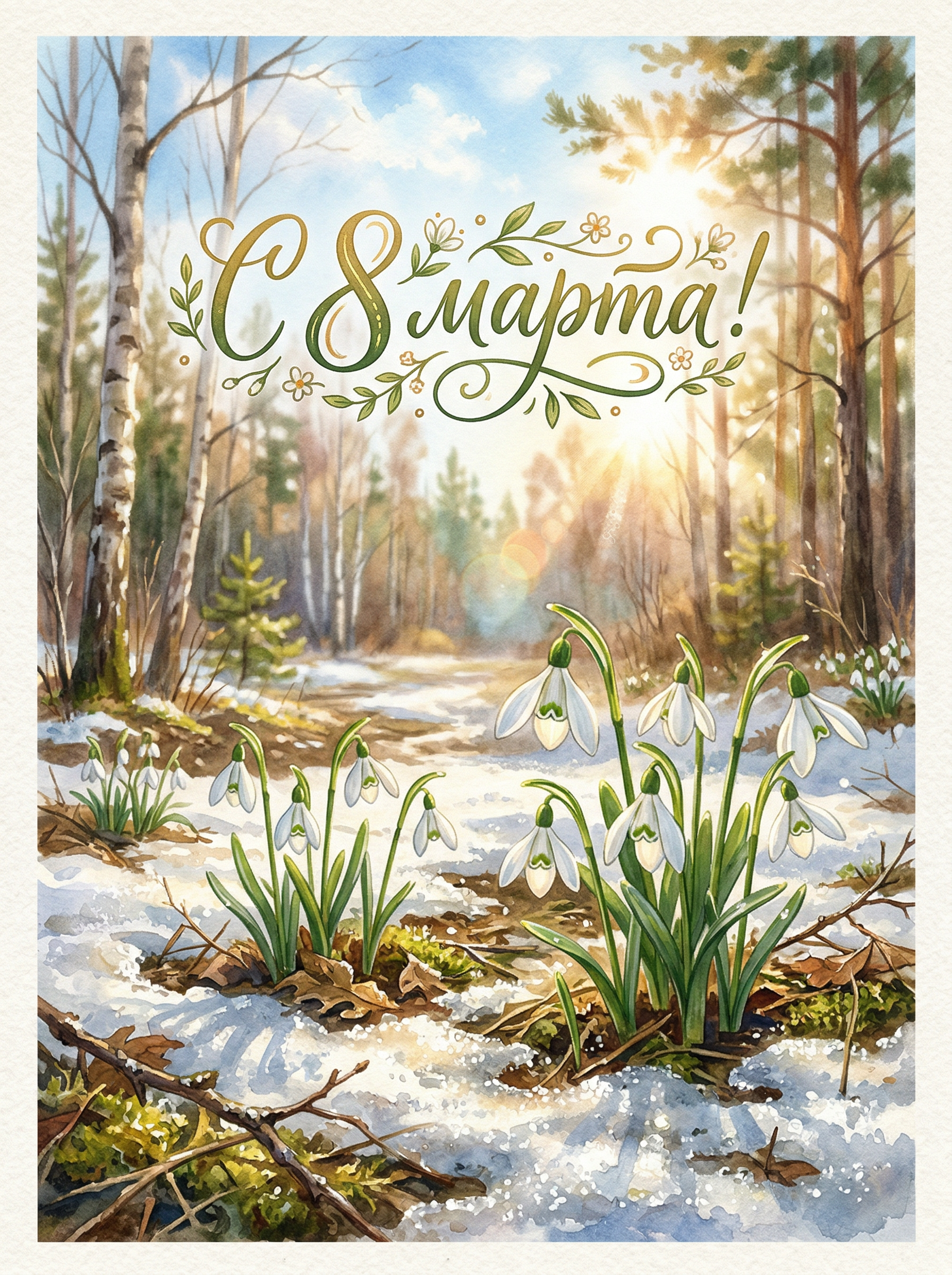 Открытка «С 8 марта: Подснежники» — послание из мира волшебства и надежды. Эти хрупкие цветы, что смело пробиваются сквозь снег, — символ стойкости и красоты. Они словно хранят в себе тайны зимних ночей и обещания тёплых дней. Пусть твоя жизнь будет такой же прекрасной и неукротимой, как подснежники, а каждый день приносит новые открытия и радость!
