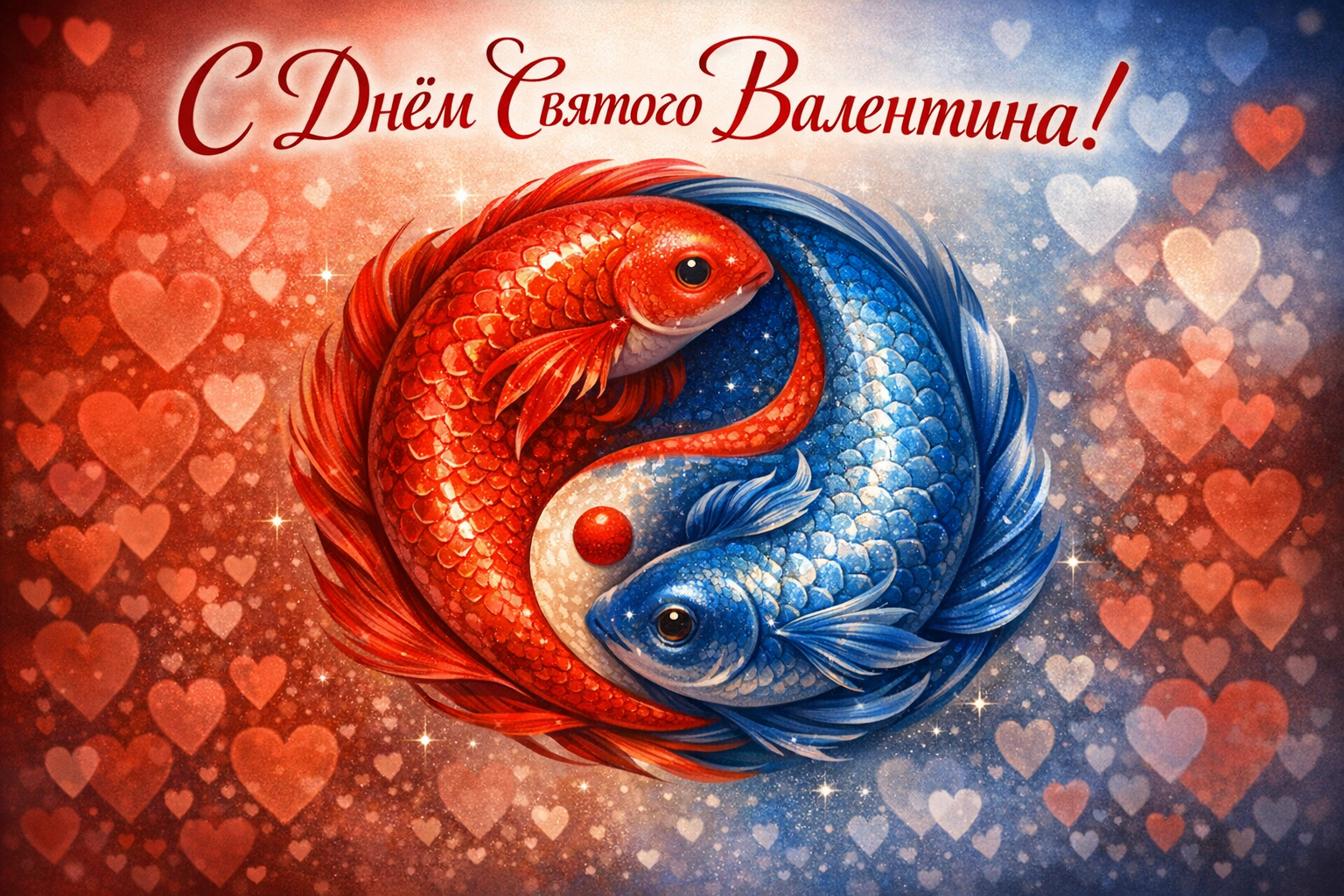 «[Имя], с Днём Святого Валентина! Рыбки инь-ян на открытке — отражение нашей уникальной связи. Пусть наша любовь будет такой же гармоничной и вечной».