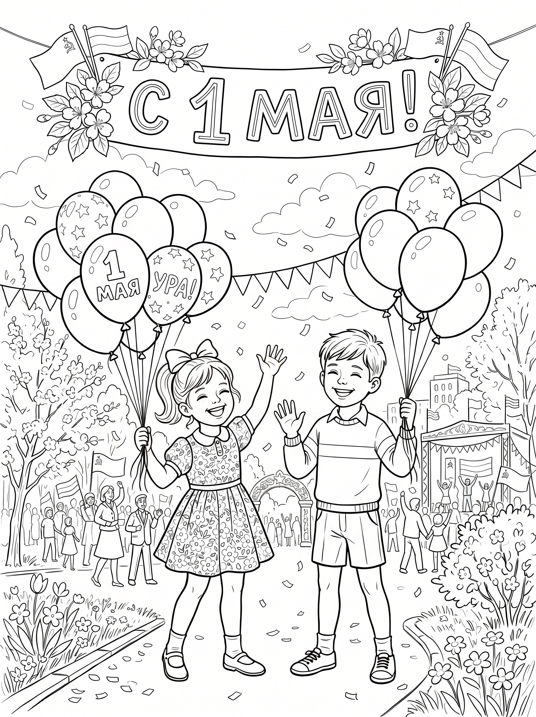 Раскраска «С 1 мая: Дети с шариками» — это увлекательный творческий досуг для вашего ребёнка в праздничные дни! На страницах — радостные дети, танцующие с яркими шарами, флажками и гирляндами. Раскрашивая весёлые сцены, малыш не только развлечётся, но и потренирует мелкую моторику, научится сочетать цвета, погрузится в атмосферу весеннего праздника.