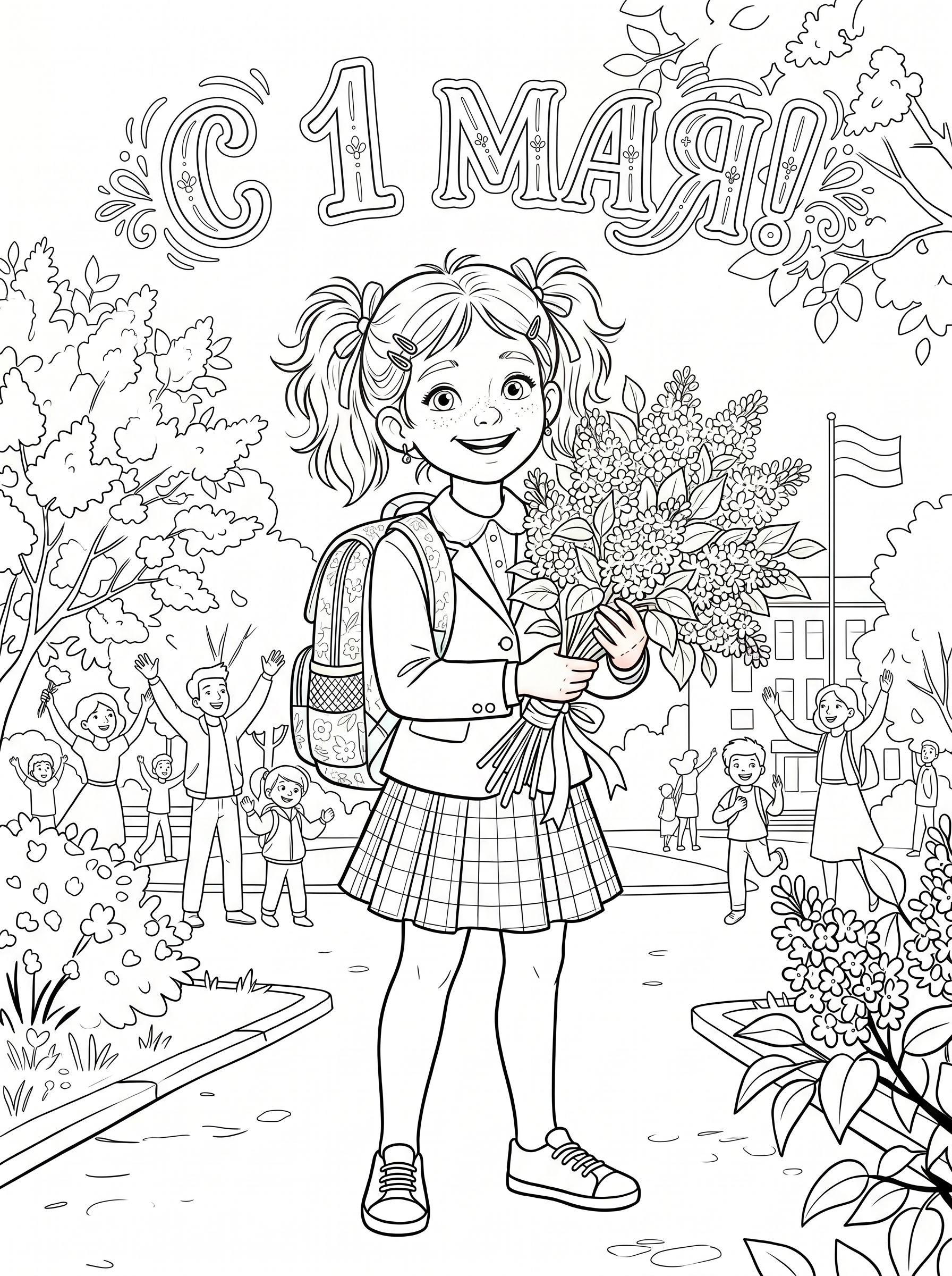 Раскраска «С 1 мая: Девочка с букетом сирени» — это творческий проект ко Дню труда, который подарит минуты удовольствия и поможет создать праздничное настроение.