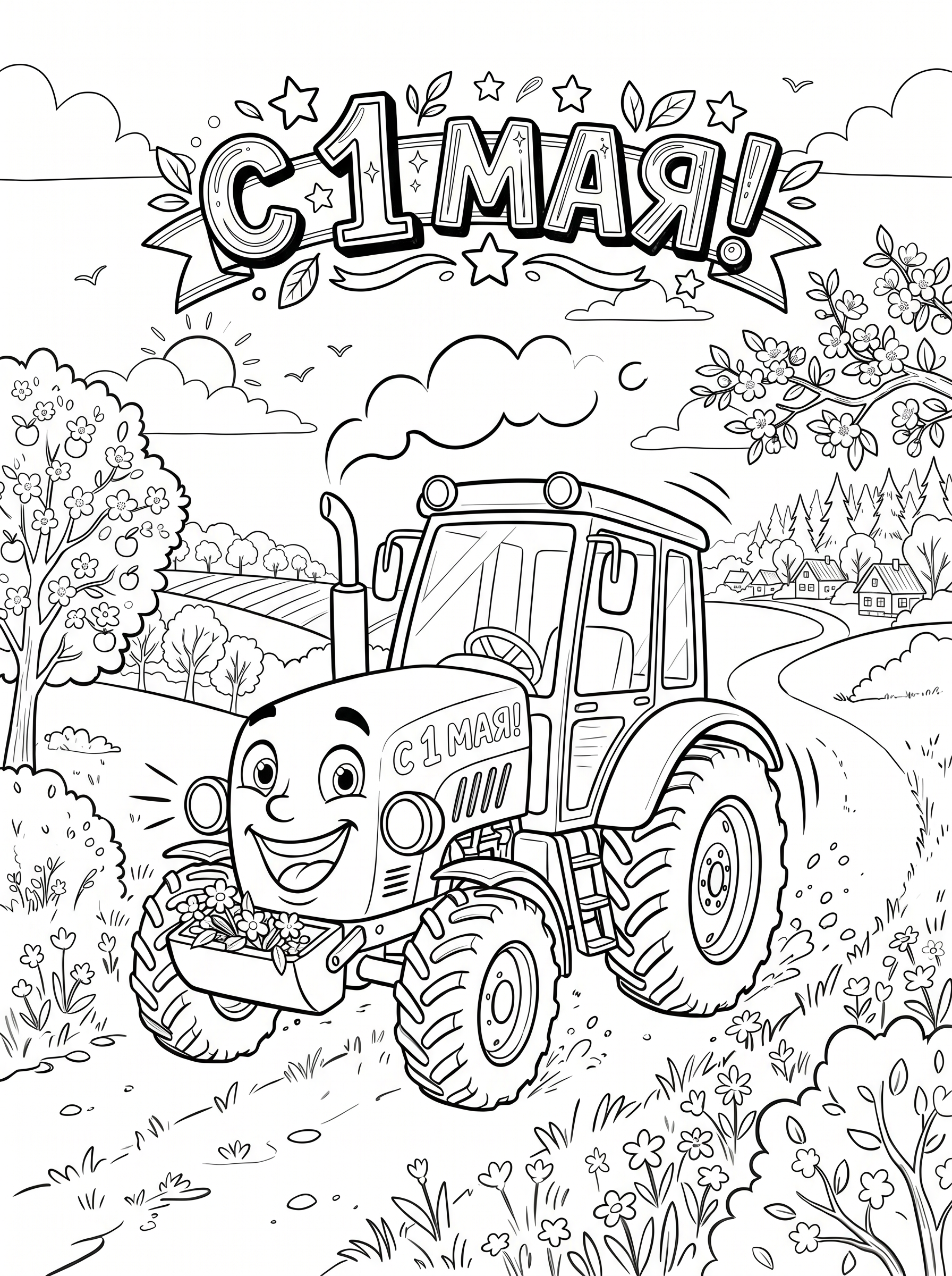 Раскраска «С 1 мая: Красный трактор» — это отличный способ провести время с ребёнком в преддверии праздника! На раскраске — жизнерадостный трактор с надписью «С 1 Мая!», окружённый весенним пейзажем: цветущие деревья, извилистая дорога, уютные домики. Вместе с ребёнком подберите яркие оттенки для трактора и фона, обсудите, почему трактор улыбается.