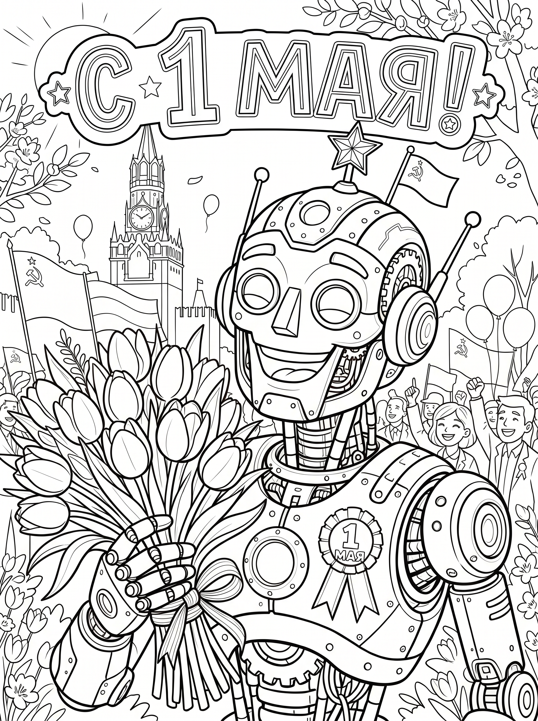 Раскраска «С 1 мая: Робот с букетом цветов» — это отличный шанс провести время с ребёнком и отметить праздник в творческой атмосфере. Позвольте малышу проявить фантазию, подобрать необычные цветовые сочетания и почувствовать дух весны.