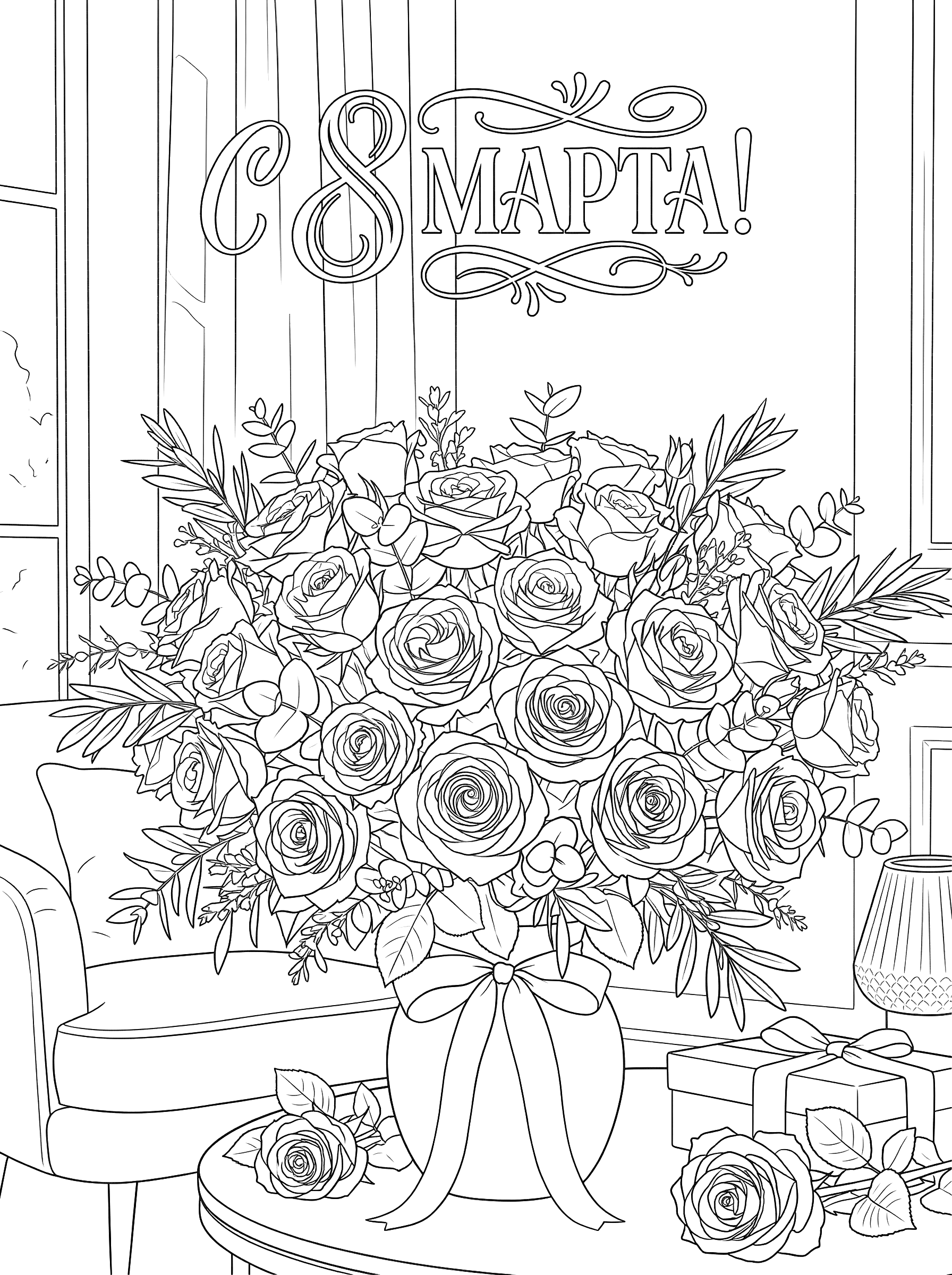 Раскраска «С 8 Марта: Букет роз» — путь к умиротворению и хорошему настроению! Погрузитесь в мир красок и форм, создайте неповторимый букет и забудьте о повседневных заботах.