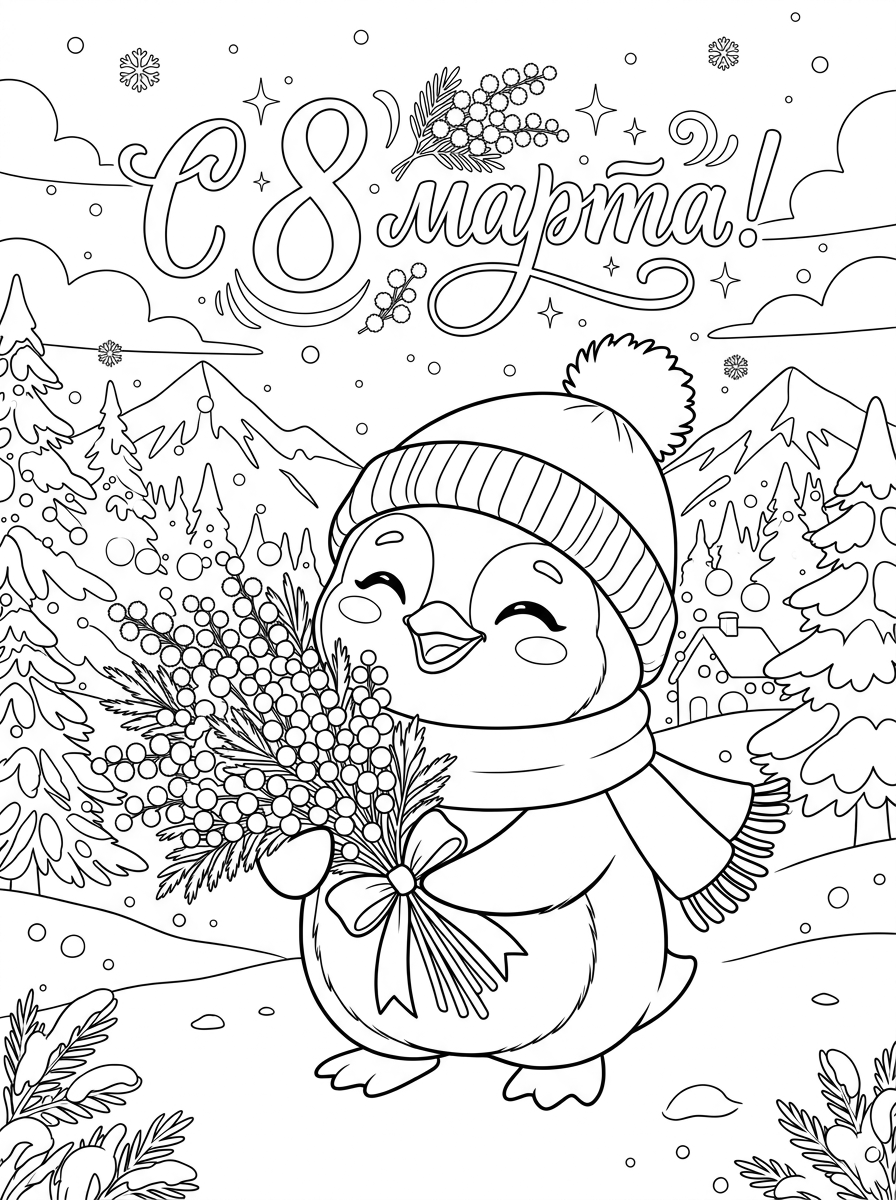 Раскраска «С 8 Марта: Пингвинёнок с букетом» — чудесный способ приятно провести время! Окунитесь в мир красок, помогите пингвинёнку преподнести шикарный букет и забудьте о повседневных хлопотах. Раскрашивание подарит вам моменты радости и расслабления. Поделитесь своим творчеством с близкими — и праздник станет ещё ярче!