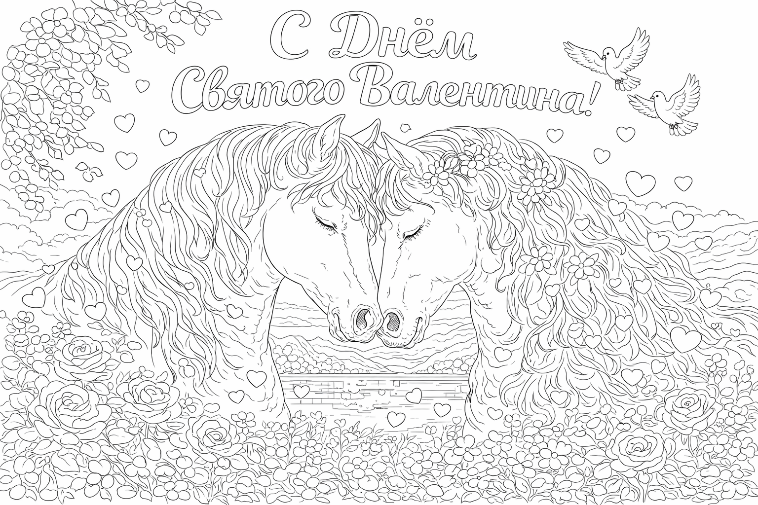 Раскраска «С Днём Святого Валентина: Лошади» — чудесный подарок для выражения любви и восхищения! Лошади символизируют силу, грацию и свободу. Раскрашивая, можно погрузиться в атмосферу праздника и подарить близкому человеку частичку своего тепла. Пусть яркие образы лошадей станут мостом к сердцам друг друга!